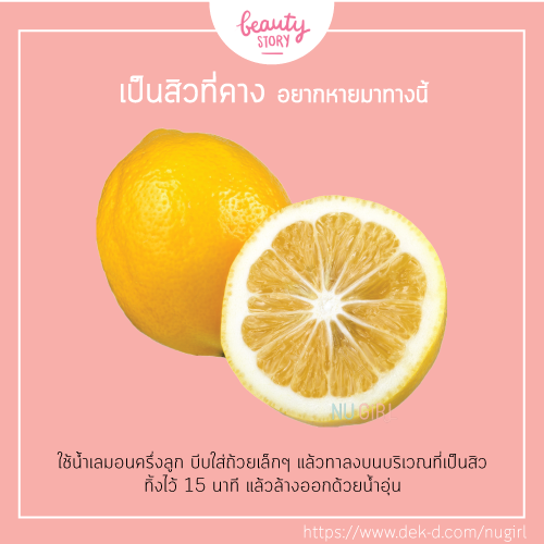 ใช้ยังไง : ใช้น้ำเลมอนครึ่งลูก บีบใส่ถ้วยเล็กๆ แล้วทาลงบนบริเวณที่เป็นสิว ทิ้งไว้ 15 นาที แล้วล้างออกด้วยน้ำอุ่น