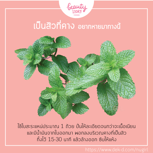 ทำไมถึงเวิร์ค : ใบสะระแหน่มีวิตามินเอ ที่ช่วยควบคุมความมันบนผิวได้ดี และช่วยให้สิวแห้งเร็วอีกด้วยค่ะ