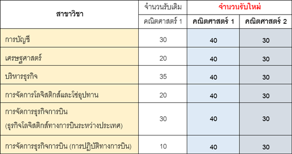 - สาขาวิชาการจัดการธุรกิจการบิน (งานบริการทางการบิน) เพิ่มจำนวน จาก 30 ที่นั่ง เป็น 50 ที่นั่ง