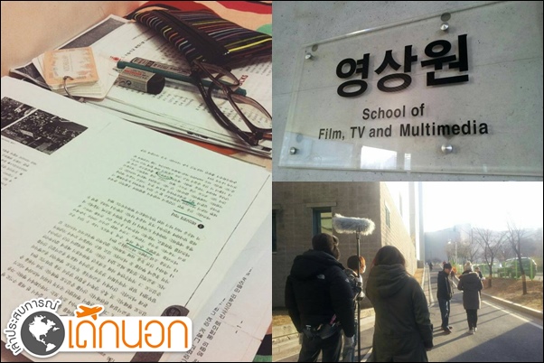 ถ้าพูดถึงเรื่องบรรยากาศการเรียน ในช่วงปีแรกที่ซายน์เข้าไปเรียน ในห้องจะมีนักเรียนประมาณ 20 คน ทั้งห้องเป็นคนเกาหลีหมด และใช่ค่ะ ซายน์เป็นชาวต่างชาติคนเดียว 5555 แรกๆ ยอมรับเลยว่าปรับตัวค่อนข้างยาก เพราะปัญหาของภาษาและความรู้พื้นฐานในสาขาวิชา ซึ่งสาขาที่ซายน์เรียนจะค่อนข้างเน้นไปที่หนังสารคดีและการถ่ายทำ จึงต้องดูสารคดีหลายเรื่องเลย แล้วก็ต้องมาเขียนรีวิว สรุปย่อ และหาข้อมูลเพื่อไปเรียนต่อใสคลาสถัดไป ถ้าเราเรียนในคลาสไม่เข้าใจ ก็จะส่งผลกระทบกับงานและการเรียนครั้งต่อๆ ไปค่ะ T___T