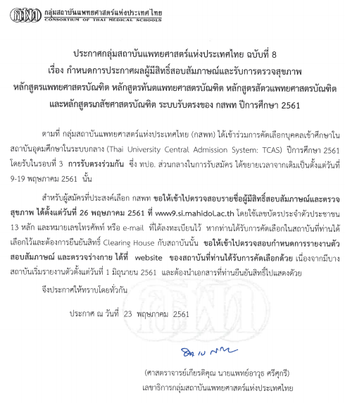 นอกจากกสพท จะระบุวันที่ประกาศรายชื่อแล้ว ยังขอให้น้องๆ ตรวจสอบกำหนดการวันรายงานตัว วันสอบสัมภาษณ์ และวันตรวจร่างกาย กับทางเว็บไซต์ของสถาบันที่เลือกไว้ เพราะบางสถาบันเริ่มรายงานตัวตั้งแต่วันที่ 1 มิถุนายน 2561