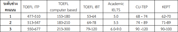 - มีผลการสอบวัดความรู้ภาษาอังกฤษ ตั้งแต่ช่วงที่ 1 ขึ้นไป