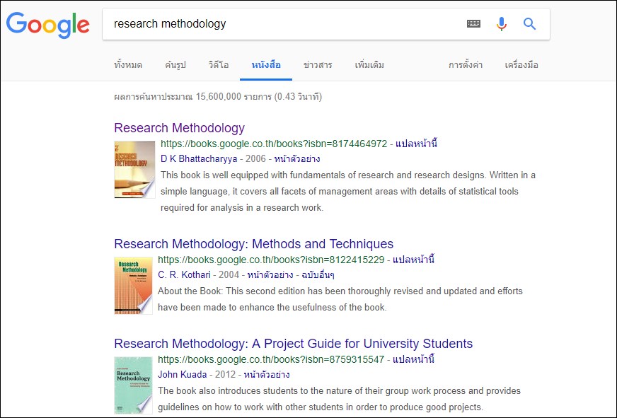 ปิดท้ายที่เว็บไซต์สุดคลาสสิกอย่าง Google ที่ไม่ว่าจะ search หาอะไรก็เจอ หรือแม้กระทั่ง ค้นหาหนังสือที่เปิดให้ดาวน์โหลดมาอ่านแบบฟรีๆ ก็ยังมีเลย อย่างเช่นในรูป พี่ search คำว่า 'Research Methodology’ หรือ กระบวนการการทำวิจัย พอค้นหาปุ๊บ ก็ขึ้นมาพรึ่บเลยครับ และแต่ละเล่มก็เริ่ดมากๆ ใครที่หา source แหล่งข้อมูลไปทำวิจัยหรือทำวิทยานิพนธ์ ก็ลองเปิดค้นหาดาวน์โหลดมาอ่าน หรือจะนำมาประกอบเป็นแหล่งอ้างอิงก็ได้เลยครับ
