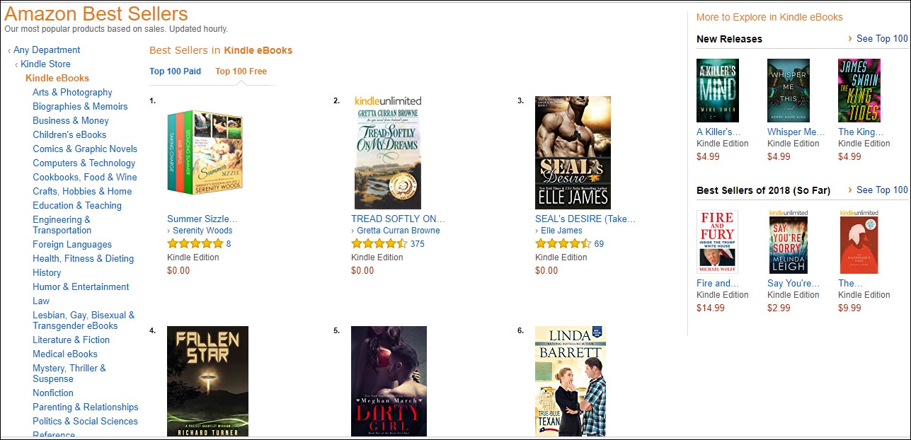 เว็บไซต์ Amazon นอกจากจะเป็นแหล่งขายหนังสือแล้ว ที่นี่ยังมีหนังสือที่เปิดให้ดาวน์โหลดไปอ่านแบบฟรีๆ แต่ส่วนใหญ่จะเป็นพวกนิยายลูกกวาดของนักเขียนต่างประเทศ ถ้าใครไม่ซีเรียสหรืออยากหาอะไรอ่านเพลินๆ เพื่อฝึกภาษาอังกฤษ ก็เข้าไปดาวน์โหลดมาอ่านกันได้ ซึ่งหนังสือที่เปิดให้โหลดฟรีจะถูกจัดอยู่ในหมวด Top100 Free ครับ