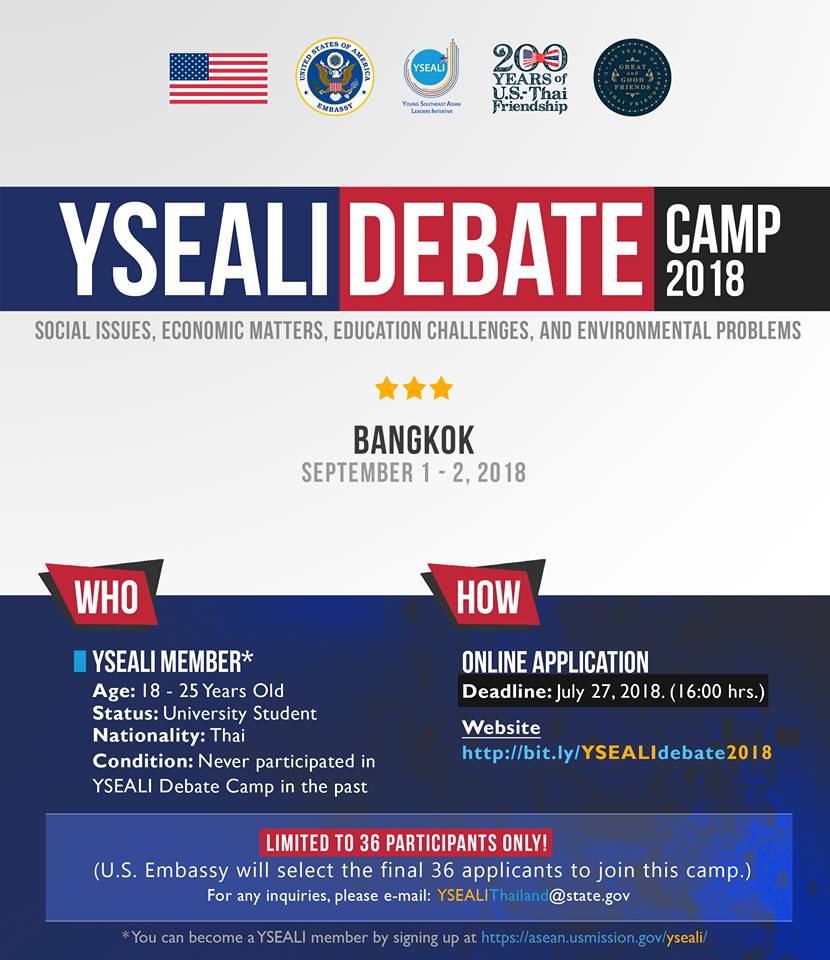 และในปีนี้ทาง YSEAIL ได้จัดโครงการอบรมโต้วาทีจากโครงการ Young Southeast Asian Leaders Initiative (YSEALI) โดยการสนับสนุนจากสถานทูตสหรัฐอเมริกา ประจำประเทศไทย ที่จะเปิดโอกาสให้ทุกคนได้เรียนรู้กระบวนการในการโต้วาทีเบื้องต้น และที่สำคัญ คือประสบการณ์สำหรับการพัฒนาตัวเอง โดยมีคุณสมบัติเบื้องต้น ดังนี้