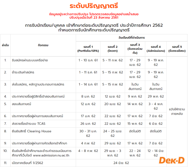 เมื่อวันพุธ (22 ส.ค.) ที่ผ่านมา ทปอ. ได้แถลงข่าวกำหนดการ TCAS 62 อย่างเป็นทางการแล้ว แต่กำหนดการที่เห็นจะเป็นรายละเอียดคร่าวๆ ของแต่ละรอบ ซึ่งน้องๆ จะต้องรอการประกาศรายมหาวิทยาลัยทั้ง 5 รอบอีกครั้งนึง