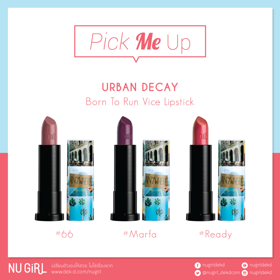 ลิปสติกรุ่น Limited Edition ที่มี 3 เฉดสีสวยทั้งเนื้อแมทท์ และเมทัลลิกประกายแวววาว แมทช์กับพาเลตต์อายแชโดว์รุ่น Born to run ของ Urban Decay ให้เม็ดสีเข้มข้น ชัดเจน แม้จะปาดลงบนริมฝีปากเพียงครั้งเดียว สีสวยติดทนนาน ไม่หลุดร่อนระหว่างวัน