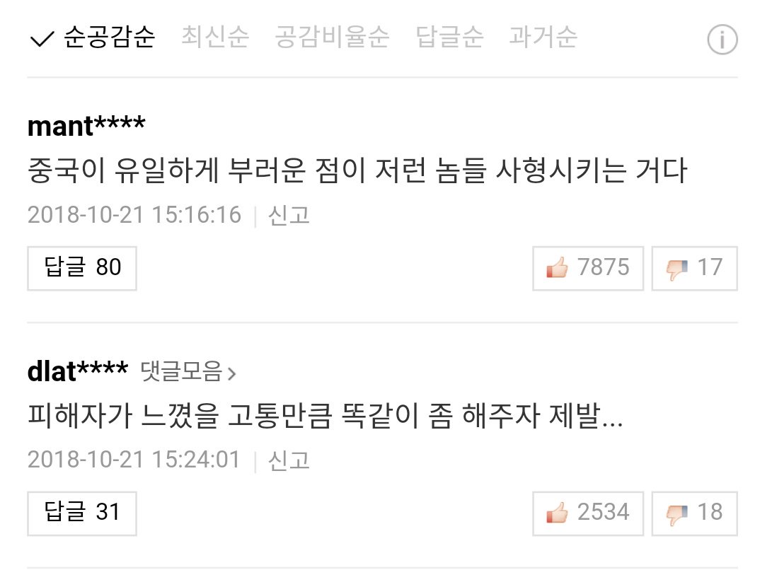 คอมเมนต์ด้านบนถูกกดไลก์ไปเกือบ 8 พันไลก์ เจ้าของโพสต์แสดงความคิดเห็นว่า "การลงโทษประหารนั้นมีที่ประเทศจีน ซึ่งพวกเราเองก็ทำได้แค่อิจฉาพวกเค้า" ส่วนคอมเมนต์ด้านล่างบอกว่า "ขอให้ฆาตกรได้เจ็บปวดเหมือนกับเหยื่อด้วยเถอะ ได้โปรด..."