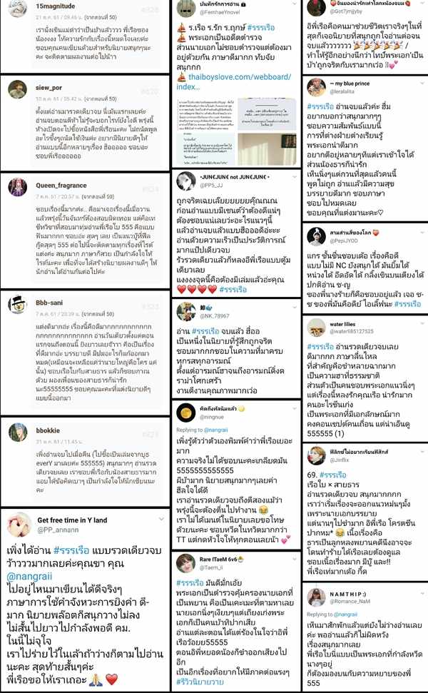 ก่อนลงนิยายให้อ่านนิยายในเด็กดีกังวลมากๆ เลยค่ะ เป็นเรื่องที่กังวลที่สุดแล้วตั้งแต่เคยลงนิยายมา ฮ่ะๆ >< เพราะว่าเป็นแนวที่ไม่เคยเขียนมาก่อน เลยไม่มีฐานคนอ่านแนวนี้อยู่เลย ค่อนข้างตื่นเต้นแล้วก็กลัวว่าจะมีใครมาอ่านมั้ย จะชอบมั้ย อ่านแล้วจะเป็นยังไงบ้างน่ะค่ะ ไม่มั่นใจอะไรเลย เพราะเป็นคนที่ประเมินตัวเองไม่เก่งด้วยค่ะ แต่พอเอามาลงแล้ว ด้วยการพูดคุยกันผ่านแฮชแท็กของเรื่อง #รรรเรือ ในโลกออนไลน์ทำให้มีคนเข้ามาอ่านเยอะกว่าที่คิดมากเลยค่ะ ตกใจแล้วก็ปลื้มใจมากๆ T///T ดีใจมากเลยที่ชอบพี่เรือใบกัน
