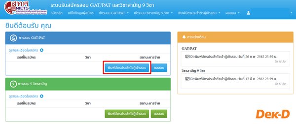 ล่าสุด ทางสทศ. ได้กลับมาเปิดระบบพิมพ์บัตรประจำตัวสอบ/ระบบพิมพ์บัตรแสดงข้อมูลเลขที่นั่งสอบและสถานที่สอบอีกครั้ง เพื่อให้น้องๆ ได้ตรวจสอบข้อมูลและพิมพ์บัตรฯ สำหรับติดตัวไปเข้าห้องสอบ โดยสามารถทำได้ผ่านเว็บไซต์สทศ. (คลิก) ตั้งแต่วันนี้ - 26 กุมภาพันธ์ 2562