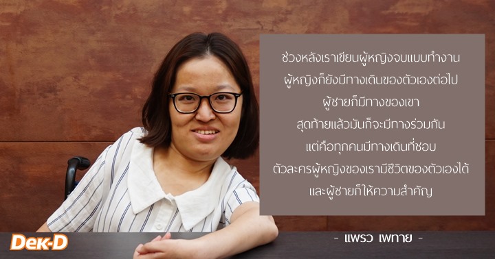 ต้องบอกว่างานช่วงหลังของแพรว แพรวชอบตัวละครหญิงทุกตัวเลยเพราะว่า 2-3 ปีหลังมานี้ เราโตขึ้นมากน่าจะอยู่ในวัยที่เรียกว่าผู้ใหญ่ก็ได้ล่ะมั้ง แล้วความคิดเราต่อผู้หญิงก็จะเป็นความคิดที่อยากจะสนับสนุนผู้หญิงให้ได้ทำอะไรตามที่เขาต้องการ โดยนำเสนอผ่านตัวละครเรา นิยายแพรวช่วงแรก ผู้หญิงแต่งงาน อยู่บ้าน เลี้ยงลูก แต่ว่าช่วงหลังเราเขียนผู้หญิงจบแบบทำงาน ผู้หญิงก็ยังมีทางเดินของตัวเองต่อไป ผู้ชายก็มีทางของเขา สุดท้ายแล้วมันก็จะมีทางร่วมกันก็คือความรัก หรืออะไรก็ตามแต่ที่เขามีร่วมกัน แต่คือทุกคนมีทางเดินที่ชอบ ตัวละครผู้หญิงของเรามีชีวิตของตัวเองได้ และผู้ชายก็ให้ความสำคัญ แล้วแพรวก็ไม่คิดว่านิยายตัวเองสะท้อนสังคมด้วยนะ เราแค่เรียกมันว่านิยายดราม่าอะไรก็ตามแต่ ส่วนจะสะท้อนไม่สะท้อน มันอยู่ที่มุมมองคนอ่านมากกว่า ถ้าเขามองว่ามันสะท้อน ก็คือเหมือนเขาให้เกียรตินิยายเรา ซึ่งเราก็จะรู้สึกดีมาก