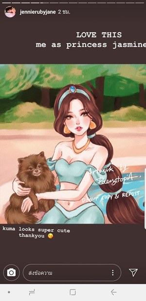 ตอนที่แพรรู้ว่าเจนนี่อัปผลงานเราลงไอจีสตอรี่ เรารู้สึกยังไงบ้าง? “เจนนี่อัปตอนประมาณ 10 โมงค่ะ แพรตื่นสายเลยไม่ได้เห็นเอง แต่เพื่อนส่งมาให้ พอเข้าไปดูโอ๊ยยยย ทั้งดีใจทั้งตกใจ นี่เรื่องจริงใช่มั้ย ศิลปิน K-Pop ที่เราตามติ่งทุกวี่ทุกวันเขารับรู้ เป็นจุดที่เราคาดไม่ถึงจริงๆ แล้วสตอรี่ของเจนนี่อีกอันนึง เขาชี้ตัวฟิกเกอร์เจ้าหญิงดิสนีย์ตามที่แพรวาดด้วย ดีใจ 2 ต่อเลยค่ะ T__T”