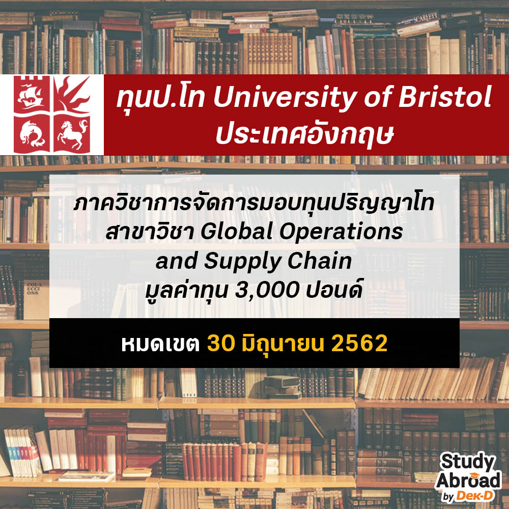 University of Bristol ตั้งอยู่ที่เมืองบริสทอล ประเทศอังกฤษ เปิดสอนมาตั้งแต่ปี 1876 ถือว่าเป็นมหาวิทยาลัยเก่าแก่และมีชื่อเสียงมากที่สุดแห่งหนึ่งของประเทศ ซึ่งทางภาควิชาการจัดการได้มอบทุนการศึกษา “Global Citizenship Scholarship” ให้กับนักศึกษาต่างชาติ เพื่อเข้าเรียนสาขาวิชา Global Operations and Supply Chain ในระดับป.โท