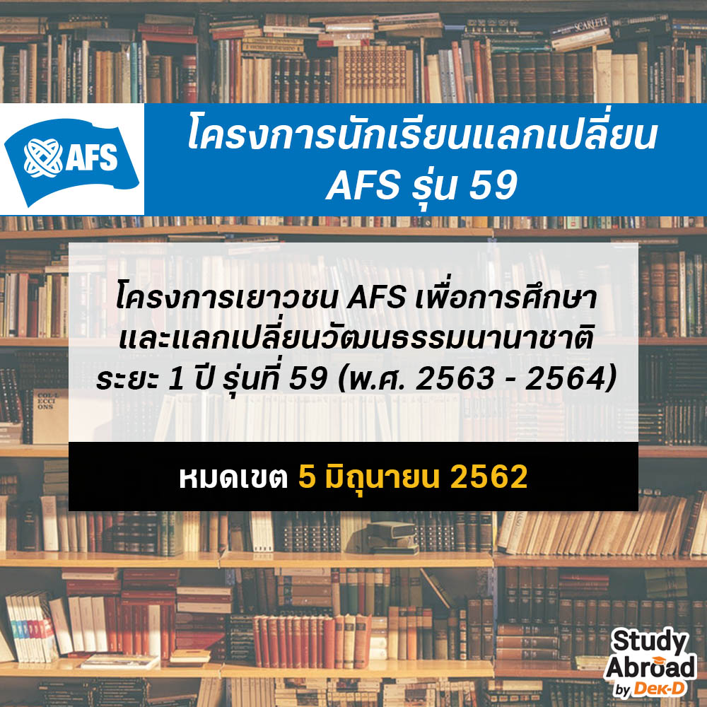 มูลนิธิการศึกษาและวัฒนธรรมสัมพันธ์ไทย-นานาชาติ (เอเอฟเอส ประเทศไทย) ได้ดำเนินการร่วมกับเอเอฟเอสโลก และประเทศสมาชิกจำนวนกว่า 50 ประเทศ จัดโครงการเพื่อการเรียนรู้ด้านภาษา และแลกเปลี่ยนวัฒนธรรม โดยมุ่งหวังในการสร้างความเข้าใจอันดี และการอยู่ร่วมกันอย่างมีความสุขระหว่างมวลมนุษยชาติ และเป็นการพัฒนาทักษะ ค่านิยมส่วนบุคคล ตลอดจนวัฒนธรรม และวิถีชีวิตความเป็นอยู่ของเยาวชน จนสามารถปรับตนเองให้อยู่ร่วมกับบุคคลอื่นที่มีความแตกต่างในหลายๆด้านได้อย่างมีความสุข ทั้งนี้เยาวชนที่เป็นคนดี มีคุณสมบัติ และความสามารถ เหมาะสมตามเกณฑ์ และมาตรฐานของเอเอฟเอสจะได้รับการคัดเลือกเป็นตัวแทนของเยาวชนไทยไปศึกษา และพำนักกับครอบครัวอุปถัมภ์ในต่างประเทศระยะเวลาประมาณ 1 ปีการศึกษา โดยโครงการเยาวชนเอเอฟเอสเพื่อการศึกษาและแลกเปลี่ยนวัฒนธรรมนานาชาติ ระยะ 1 ปี รุ่นที่ 59 (พ.ศ. 2563 - 2564) นี้เปิดรับสมัครตั้งแต่วันที่ 1 เมษายน 2561 ถึงวันที่ 5 มิถุนายน 2562