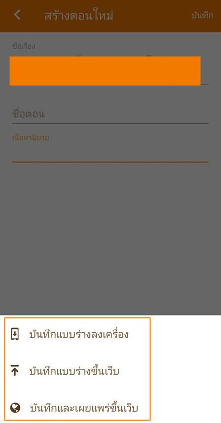 - บันทึกแบบร่างขึ้นเว็บ เป็นการเซฟดราฟลงระบบนิยายเลย สามารถกดเผยแพร่ทันทีเมื่อต้องการ ทั้งผ่านแอปและหน้าเว็บไซต์ ในกรณีนี้ถ้ามือถือหายก็ไม่ต้องห่วง ดราฟของเราไม่ได้หายตาม เพราะมันอยู่ในระบบเรียบร้อยแล้วจ้า
