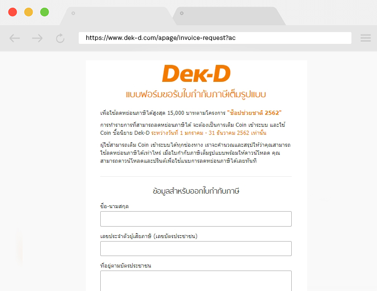 ตอบ สามารถกรอกแบบฟอร์มขอรับใบกำกับภาษีบนเว็บไซต์ Dek-D ได้ที่นี่ หรือเข้าจากหน้าแรกของเว็บไซต์ Dek-D และคลิกตัวเลือก "Coin ของฉัน" จากนั้นทางซ้ายมือของหน้าเว็บจะแสดงตัวเลือก "ใบกำกับภาษี (ช็อปช่วยชาติ)" สามารถเข้าไปกรอกข้อมูลสำหรับออกใบกำกับภาษีได้เลย