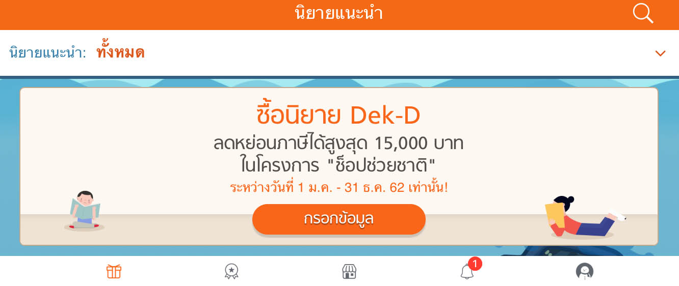 สวัสดีค่ะชาวเด็กดีทุกคน ตอนนี้เราอ่านนิยายบนเว็บไซต์ Dek-D มาถึงกลางปี 2562 กันแล้วนะคะ ใครที่ชอบอ่านนิยายออนไลน์ และเป็นนักช็อปตัวยง ซื้อ Coin สนับสนุนนักเขียนและนิยายเรื่องโปรดบน Dek-D เป็นประจำ พี่มาย้ำเตือนชาวเด็กดีทุกคนว่า อย่าลืมกรอก "แบบฟอร์มขอรับใบกำกับภาษีเต็มรูปแบบ" เพื่อใช้ลดหย่อนภาษีตามโครงการ "ช็อปช่วยชาติ 2562" กันนะคะ เพราะแค่ซื้อนิยาย Dek-D ก็สามารถใช้สิทธิลดหย่อนภาษีได้สูงสุดถึง 15,000 บาทเลยทีเดียว! โดยรายการที่สามารถลดหย่อนภาษีได้นั้น จะต้องเป็นการเติม Coin เข้าระบบ และใช้ Coin ซื้อนิยาย Dek-D ระหว่างวันที่ 1 มกราคม - 31 ธันวาคม 2562 เท่านั้นนะคะ!