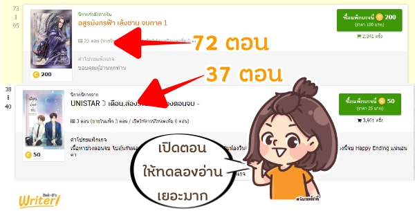 แตกต่างจากนิยายที่เปิดให้ทดลองอ่านทีละมากๆ นักอ่านจะติดตามนิยายจนรู้สึกผูกพันกับตัวละคร ตลอดจนทราบถึงเนื้อหา สไตล์การเขียน และสำนวนภาษาของนักเขียนชัดเจน จนทำให้สามารถตัดสินใจซื้อแพ็กเกจนิยายได้ง่ายดายกว่า เช่น นิยายเรื่อง อสูรมังกรฟ้า เล้งซาน ที่เปิดตอนให้อ่านก่อนรวมแพ็กถึง 72 ตอน และหลังจากเปิดแพ็กเกจก็มียอดขายแพ็กแรกกว่า 2,341 ครั้ง หรือจะเป็นนิยายเรื่อง UNISTAR เดือน.ล่อง.หน ก็เปิดให้อ่านฟรีเกือบจบเรื่องถึง 37 ตอน และมียอดขายหลังปิดแพ็กถึง 3,900 ครั้งเลยค่ะ