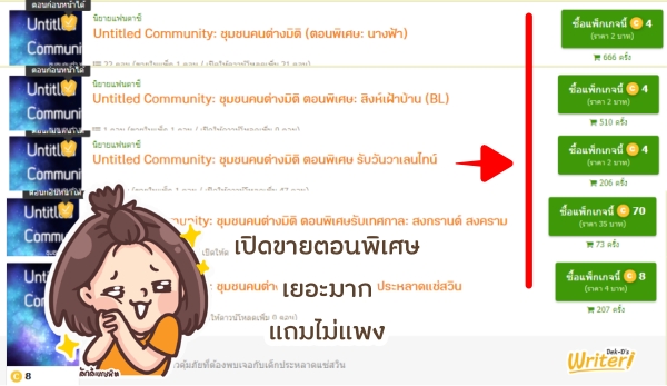 เหมือนกับนิยายเรื่อง Untitled Community: ชุมชนคนต่างมิติ นิยายขายดีติดอันดับของร้านค้าเด็กดีที่เปิดขายเฉพาะตอนพิเศษถึง 7 แพ็ก และมียอดซื้อต่อแพ็กไม่ต่ำกว่า 100 ครั้ง!