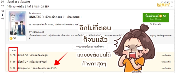 เห็นไหมล่ะคะ ว่าการจัดแพ็กเกจให้ขายดีไม่ใช่เรื่องยากเลย เพียงแค่เราไม่ตั้งราคาที่ไกลเกินเอื้อมถึง (หากกลัวไม่ได้ราคาตามต้องการก็ใช้เทคนิคซอยตอนเป็นหลายแพ็กแทน) และตัดตอนปิดแพ็กได้อย่างมีชั้นเชิง (ทิ้งให้นักอ่านค้างคา) ก็สามารถดึงดูดนักอ่านให้มาซื้อแพ็กนิยายของเราได้มากมายแล้วค่ะ