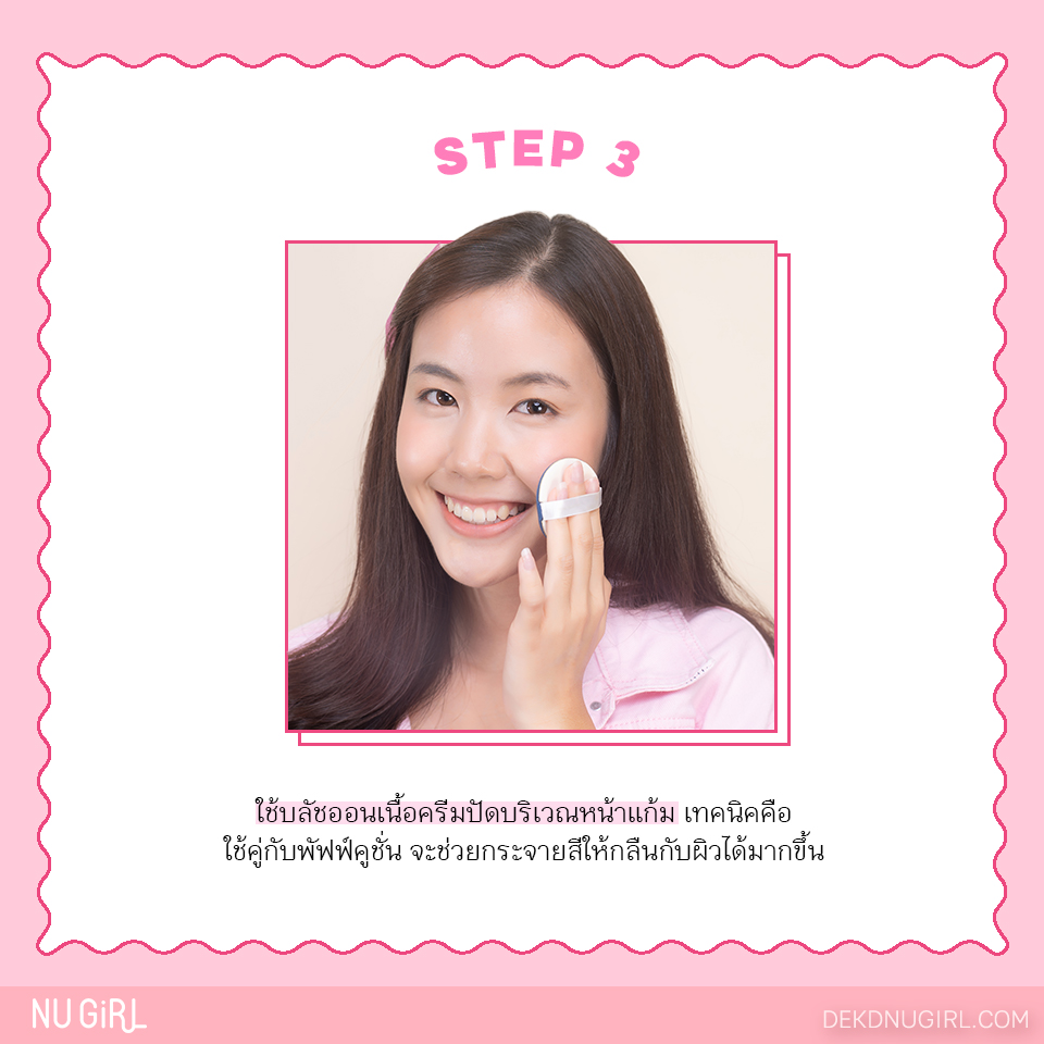 ใช้บลัชออนเนื้อครีมปัดบริเวณหน้าแก้ม เพราะนาทีนี้เราต้องการความติดทน เลือกสีที่ดูสดใสๆ อย่างสีคอรัลที่กำลังมาแรงในปีนี้ เทคนิคคือใช้คู่กับพัฟฟ์คูชั่น จะช่วยกระจายสีให้กลืนกับผิวได้มากขึ้นค่ะ