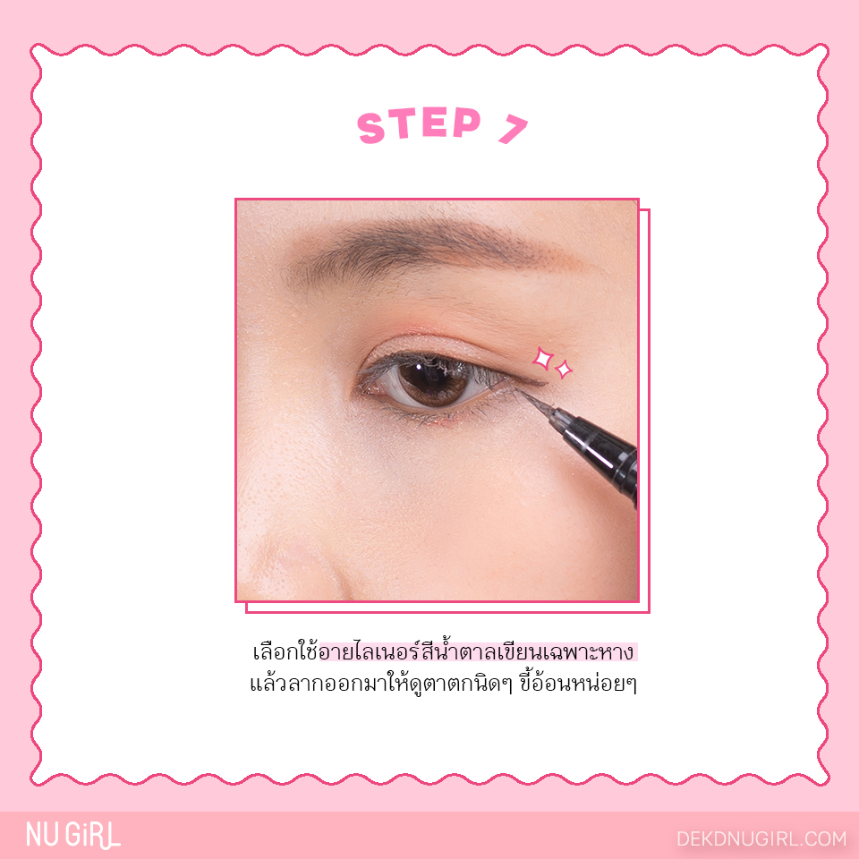 เลือกใช้อายไลเนอร์สีน้ำตาลเขียนเฉพาะหาง แล้วลากออกมาให้ดูตาตกนิดๆ ขี้อ้อนหน่อยๆ