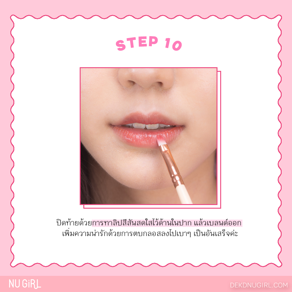 ปิดท้ายด้วยการทาลิปสีสันสดใสไว้ด้านในปาก แล้วเบลนด์ออก เพิ่มความน่ารักด้วยการตบกลอสลงไปเบาๆ เป็นอันเสร็จค่ะ