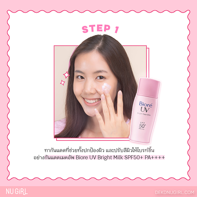 อย่างที่รู้กันว่าไปคอนเดี๋ยวนี้ เราอาจจะไม่ได้อยู่แค่ในฮอลล์เย็นๆ แต่ยังต้องเจอกับแดดข้างนอกที่ร้อนเปรี้ยงด้วย เพราะฉะนั้นขั้นตอนแรกก็ต้องทากันแดด แต่เราก็ต้องการให้ผิวดูไบรท์ด้วย เราจึงจะใช้กันแดดหน้าพุ่งที่เป็นเหมือนเบสเมคอัพ อย่าง Biore UV Bright Milk SPF50+/PA++++ “กันแดดหน้าพุ่ง”