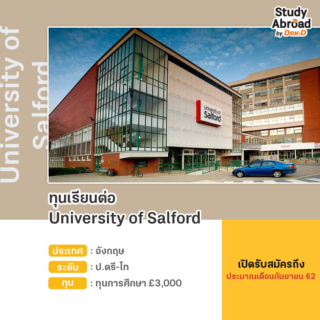 University of Salford เป็นมหาวิทยาลัยที่ตั้งอยู่ในเมืองแมนเชสเตอร์ ประเทศอังกฤษ ที่นี่เป็นสถาบันอายุน้อยที่มีอายุเพียง 50 กว่าปี แต่นับว่าเป็นสถาบันที่มีคุณภาพมาก อีกทั้งยังได้รับการจัดอันดับให้อยู่ใน 150 มหาวิทยาลัยอายุน้อยกว่า 50 ปีที่ดีที่สุดอีกด้วย และในทุกๆ ปีทางมหาวิทยาลัยก็มักจะมอบทุนให้กับนักศึกษาต่างชาติ รวมถึงคนไทยด้วยครับ