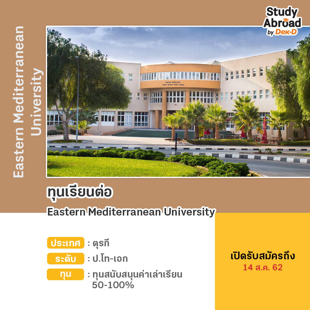 Eastern Mediterranean University ก่อตั้งขึ้นในปี 1979 ที่นอร์เทิร์นไซปรัส เปิดสอนในระดับปริญญาตรี 108 หลักสูตร และในระดับปริญญาโท-เอกอีก 96 หลักสูตร โดยทางมหาวิทยาลัยได้มอบทุนการศึกษาให้กับนักศึกษาต่างชาติที่จะเข้าเรียนสาขาใดก็ได้ ในภาคฤดูใบไม้ร่วง (Fall Semester) ปีการศึกษา 2019-20 ทั้งในระดับปริญญาโทและเอกครับ
