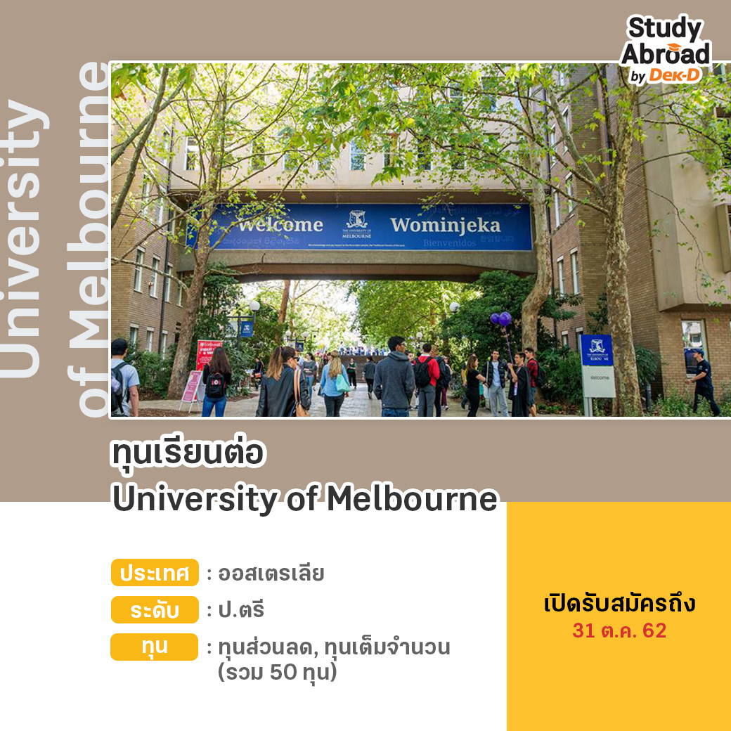 ทุน Melbourne International Undergraduate Scholarships นี้เป็นทุนจากมหาวิทยาลัย University of Melbourne ที่เมลเบิร์น ประเทศออสเตรเลีย เป็นมหาวิทยาลัยอันดับสองที่เก่าแก่ที่สุดในประเทศ ทุนนี้เป็นทุนที่แจกเป็นประจำทุกปีอยู่แล้วครับ โดยการคัดเลือกเด็กที่ได้รับทุนรอบเดือนเมษายนและพฤษภาคม จะเป็นการคัดเลือกเพื่อให้ทันเข้าเรียนใน Semester 2 ส่วนการคัดเลือกรอบเดือนพฤศจิกายน ธันวาคมและมกราคม จะเป็นการคัดเลือกเพื่อให้ทันเข้าเรียนใน Semester 1 หรือ 2 ดังนั้น น้อง ๆ ต้องคอยเข้าไปอัปเดตความเคลื่อนไหวที่เว็บไซต์ของทางมหาวิทยาลัยนะคะ เพราะจะมีเปิดรับสมัครอยู่เรื่อย ๆ ใครที่พลาดรอบนี้ ก็เตรียมความพร้อมไว้ในครั้งถัดไปได้ครับ