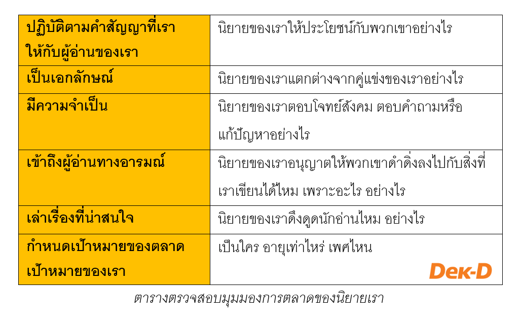 อย่างที่สอง ตารางทำให้เรามองเห็นมุมมองการตลาดและนักอ่านมากขึ้น ช่วยให้เราตรวจสอบดูว่างานเขียนของเราสอดคล้องกับตลาดเป้าหมายของเรามั้ย มีอะไรต้องปรับปรุงหรือพัฒนาไหม ดังตารางข้างล่าง ซึ่งน้องๆ สามารถก็อปไปใช้ได้