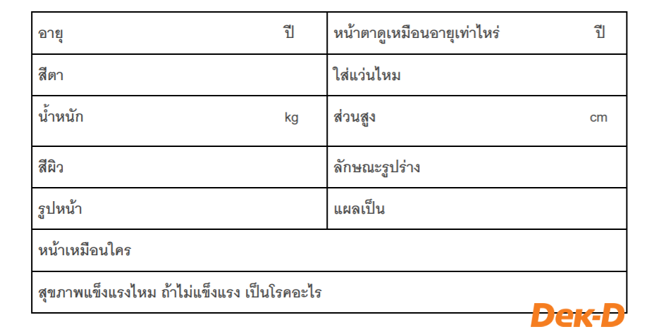 - ลักษณะภายนอก - อายุ น้ำหนัก ลักษณะรูปร่าง สีผิว แผลเป็น รูปหน้า