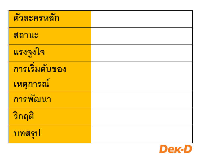 ซึ่งด้านล่างนี้คือตัวอย่างของตารางที่นักเขียนสามารถหยิบไปสร้างเป็นเวอร์ชั่นของตัวเองได้ รับรองว่าเราจะเข้าใจตัวละครมากขึ้นแน่นอน แต่ถ้าใครรู้สึกว่าตารางที่ให้ยังไม่จุใจ เพื่อนนักเขียนเด็กดีได้แจกแบบฟอร์มการสร้างตัวละคร ลองคลิกไปดูได้ที่ How To Write :' เคล็ดลับในการเขียนนิยาย XD ของฌามส์ เลยค่ะ