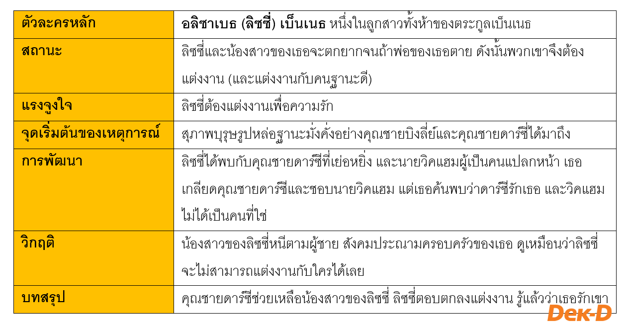 ไงล่ะ ฟังดูง่ายใช่มั้ย ทั้งหมดนี้คือพล็อตเรื่องหลักของ “Pride and Prejudice” ดูง่ายมากเลยแหละ เราก็แค่ทำสิ่งเดียวกันนี้กับหนังสือหรือไอเดียของเรา และทำให้มันง่ายเข้าไว้ ในความเป็นจริงหากเราพยายามที่จะรู้ทุกสิ่งที่อยู่ในส่วน “การพัฒนา” เราสามารถจดโน้ตเป็นความเห็นไว้ข้างๆ หรือเพิ่มคอลัมน์เป็นชื่อ comment ยกตัวอย่างเช่น ถ้าเราเป็นเจน ออสเตน เราอาจเริ่มต้นด้วยการพูดอะไรบางอย่างเช่น “ลิซซี่ห่างกันสักพักกับวิคแฮม เพราะมันดันกลายเป็นว่าเขาเป็นคนไม่ดี เขาทำอะไรล่ะ...เขาฆ่าใครบางคน? ขโมยเงิน หรืออื่นๆ อีก? มีมากมายที่ชวนคิด