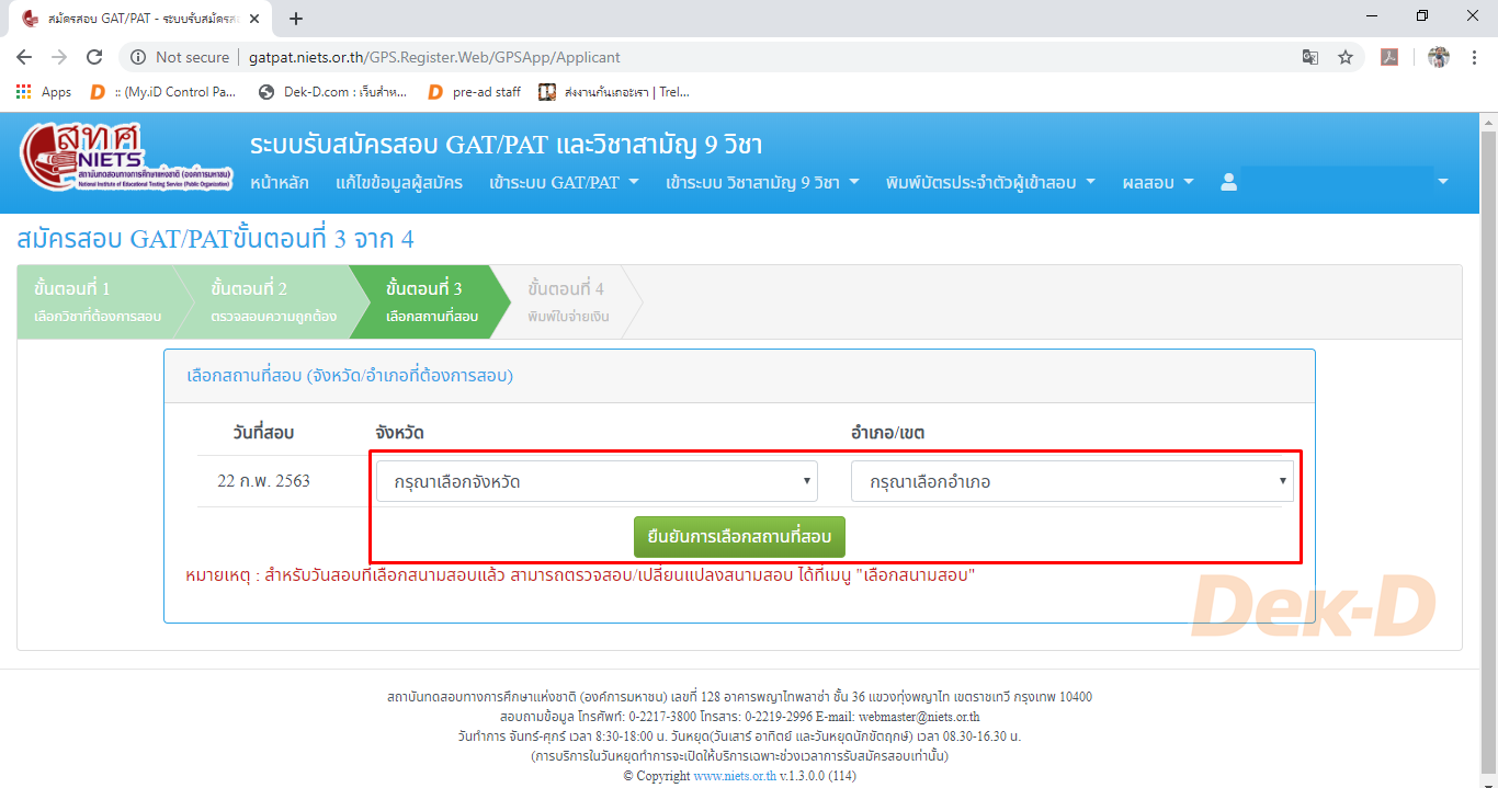 5) เลือกสนามสอบ โดยเลือก “จังหวัด” และ “อำเภอ/เขต” จากนั้นก็ “ยืนยันการเลือกสถานที่สอบ” (สำหรับคนที่เลือกสนามสอบในกรุงเทพฯ นนทบุรี และปทุมธานี ให้กลับมาเลือกสนามสอบอีกครั้ง หลังจากชำระเงินค่าสมัคร)
