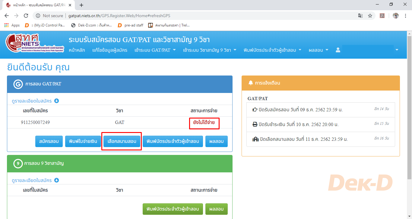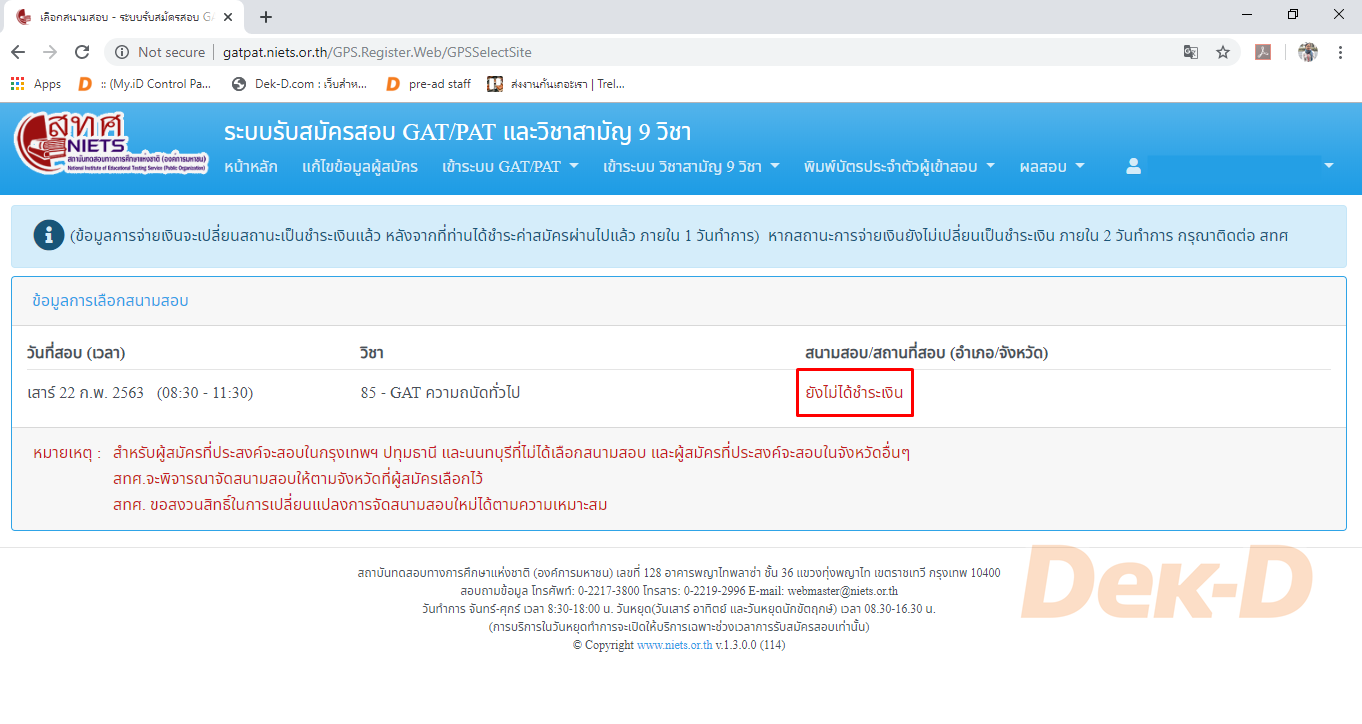 7) ให้กลับเข้ามาเช็กสถานะการจ่ายเงิน และสำหรับคนที่เลือกสนามสอบในกรุงเทพฯ นนทบุรี และปทุมธานี ให้กลับมาเลือกสนามสอบอีกครั้ง โดยให้เลือกสนามสอบที่ต้องการ และยังมีสถานะว่างอยู่ จากนั้นก็ยืนยันการเลือกสนามสอบ