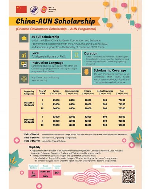ทุนรัฐบาลจีนร่วมกับ ASEAN University Network (AUN) เป็นโครงการทุนเต็มจำนวนมอบโดยกระทรวงศึกษาธิการแห่งจีน เพื่อสนับสนุนนักศึกษา, คุณครู และผู้รับทุนจากประเทศต่างๆ ในอาเซียน ให้ได้มีโอกาสในการเดินทางมาศึกษาต่อในประเทศจีน ซึ่งทุนนี้เป็นทุนที่มอบให้ทุกๆ ปี และสำหรับปีนี้มอบให้มากถึง 30 ทุนด้วยกัน