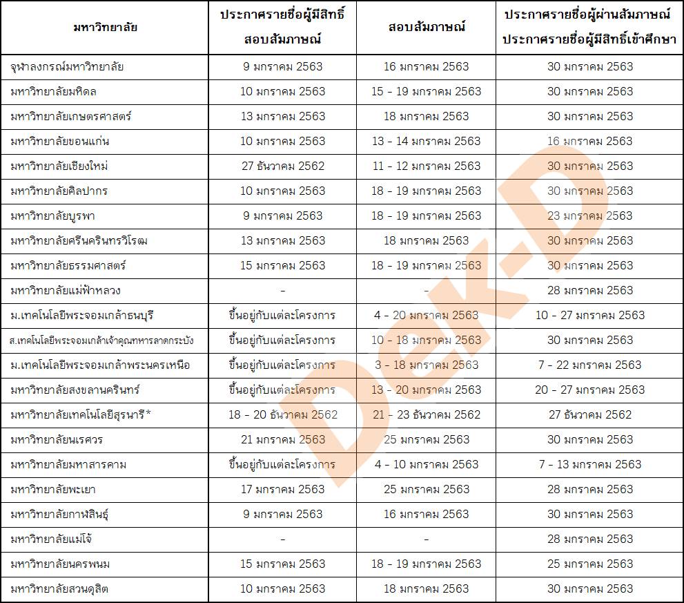 จากตารางข้างต้น ช่วงวันที่เป็นเพียงภาพรวมของแต่ละมหาวิทยาลัยเท่านั้น น้องๆ จะต้องตรวจสอบกำหนดการ และรายละเอียดปลีกย่อยต่างๆ เป็นรายคณะ ตามแต่ละสาขาวิชาที่สมัครไป โดยการประกาศรายชื่อผู้มีสิทธิ์สอบสัมภาษณ์นั้น จะประกาศผ่านเว็บไซต์มหาวิทยาลัย หรือ/และ เว็บไซต์คณะ ส่วนการประกาศผลการสัมภาษณ์ ทปอ. จะประกาศพร้อมกันในวันที่ 30 มกราคม 2563 แต่บางมหาวิทยาลัยก็จะมีการประกาศก่อนในหน้าเว็บไซต์ของตัวเอง