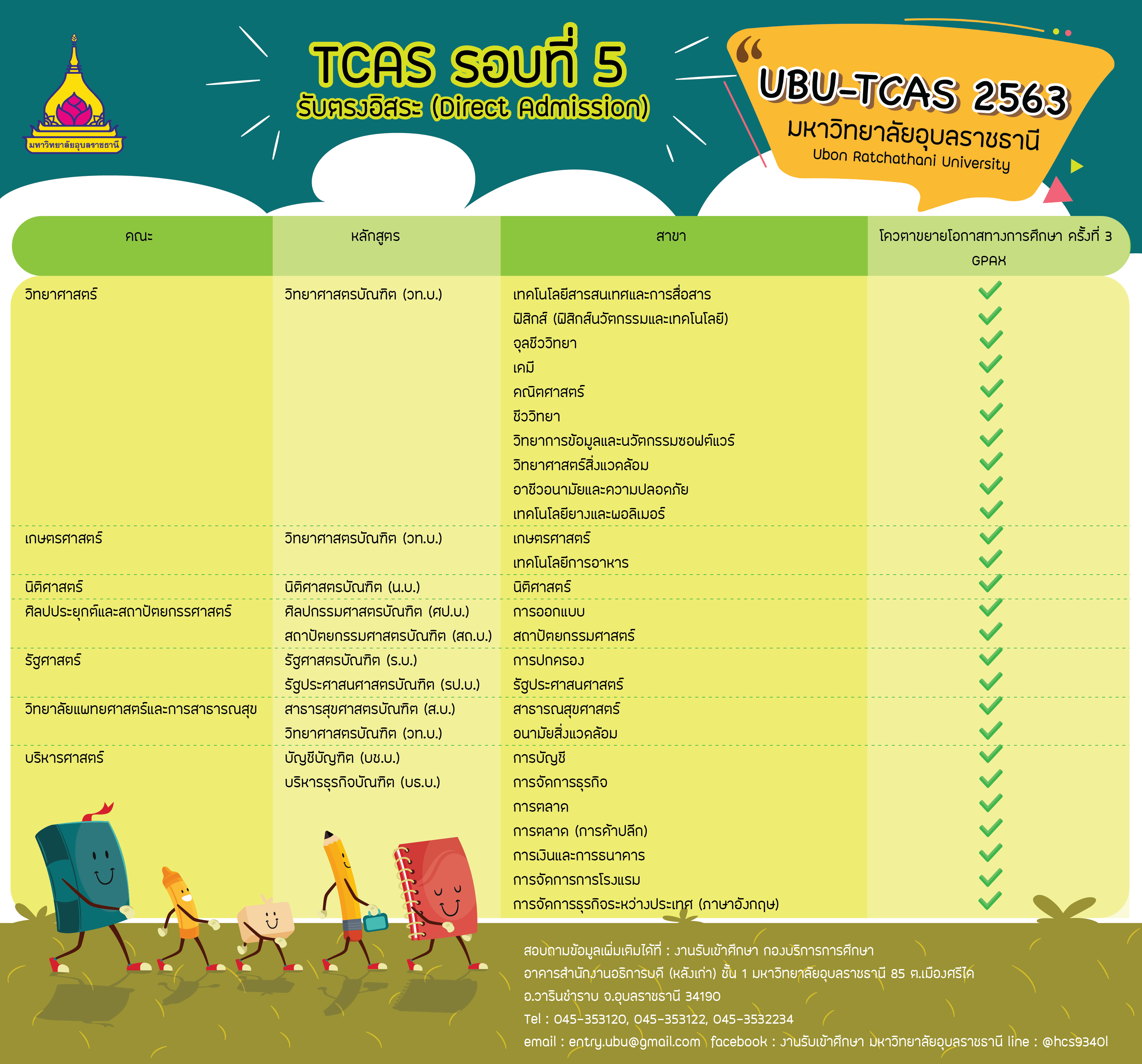 สำหรับน้องๆ คนไหนที่เล็ง TCAS รอบ 5 หรือรับตรงอิสระ ที่ไม่ใช่มหาวิทยาลัยอุบลราชธานีไว้ พี่แนนนี่ขอแนะนำตรงนี้เลยว่าให้ไปตรวจสอบกับทางสาขาวิชาว่า ในปี 2563 นี้จะเปิดรับหรือไม่ แม้ว่าปีที่แล้วจะเปิดรับก็ตาม เพราะถ้าให้พูดกันตามตรง คณะที่เปิดรับในรอบรับตรงอิสระ เพียงรอบเดียวของปี 2562 อย่างคณะการแพทย์แผนไทยอภัยภูเบศร์ ม.บูรพา ในปีนี้ (2563) ก็มีไปเปิดรับในรอบที่ 4 (Admission) และหน้าเว็บไซต์มหาวิทยาลัยก็ไม่มีรายละเอียดของรอบที่ 5 เลยล่ะค่ะ