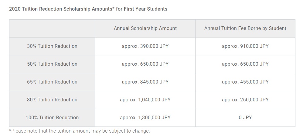 Ritsumeikan Asia Pacific University หรือ APU มอบทุนการศึกษาให้แก่นักศึกษาต่างชาติที่มีผลการเรียนดี โดยทุนที่ให้เป็นทุนลดค่าเล่าเรียนแบ่งออกเป็นประเภทได้แก่ 30%, 50%, 65%, 80% หรือ 100% ตลอด 4 ปี จนจบการศึกษาสำหรับปริญญาตรี นอกจากนี้ หลังจากเข้าไปเรียนที่ APU แล้วนักศึกษายังสามารถสมัครขอรับทุนอื่นๆ เพิ่มเติมได้อีกด้วย โดยทุนที่ APU นั้นจะพิจารณาจากคุณสมบัติของนักเรียนทั้งความสามารถทางการเรียนและความสามารถพิเศษต่างๆ จากกิจกรรมนอกชั้นเรียน