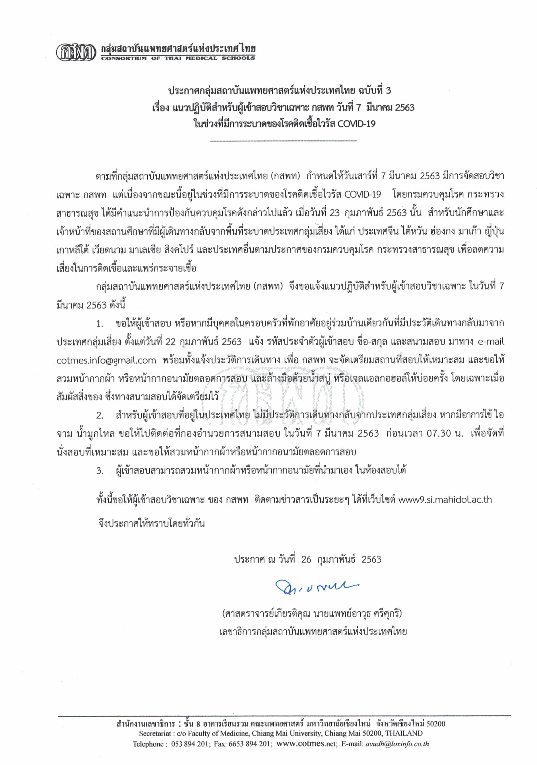 1) ให้ผู้เข้าสอบ หรือถ้ามีคนที่อยู่บ้านเดียวกัน มีประวัติเดินทางกลับมาจากประเทศกลุ่มเสี่ยง (จีน ไต้หวัน ฮ่องกง มาเก๊า ญี่ปุ่น เกาหลีใต้ เวียดนาม มาเลเซีย สิงคโปร์ อิตาลี อิหร่าน เยอรมัน ฝรั่งเศส และประเทศอื่นๆ ตามประกาศฯ) ตั้งแต่วันที่ 22 ก.พ. 63 แจ้งรหัสประจำตัวผู้เข้าสอบ ชื่อ-สกุล สนามสอบ พร้อมประวัติการเดินทาง ไปยังอีเมล cotmes.info@gmail.com ภายในเวลา 16.00 น. ของวันที่ 5 มีนาคม 2563 เพื่อจัดเตรียมสถานที่สอบให้เหมาะสม และขอให้ใส่หน้ากากอนามัยตลอดการสอบ และล้างมือด้วยสบู่ หรือเจลล้างมือให้บ่อยครั้ง