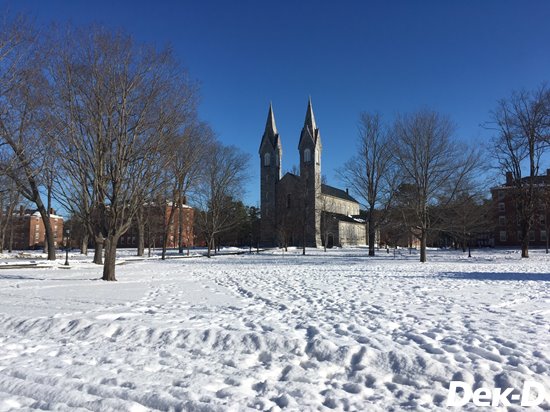"เล่าก่อนว่ามหา'ลัยที่ฟิล์มเรียนตั้งอยู่เมือง 'Maine' ชื่อนี้หลายคนอาจไม่คุ้นเพราะไม่ใช่รัฐท่องเที่ยว แต่คนอเมริกันชอบมาพักผ่อนกันค่ะ เมืองนี้จะเป็นเมืองบรรยากาศสบายๆ มีต้นไม้ ทะเล แม่น้ำ แล้วรู้สึกปลอดภัยพอสมควร ถ้าวันไหนจำเป็นต้องกลับดึก ตี 1-2 ก็เดินกลับหอคนเดียวได้สบายๆ เลย และอีกจุดเด่นนึงคือหิมะตกยาวนานมาก ตั้งแต่ พ.ย. และอาจยิงยาวไปถึง เม.ย. เราโอเคมากเพราะมันสวย~ 555"