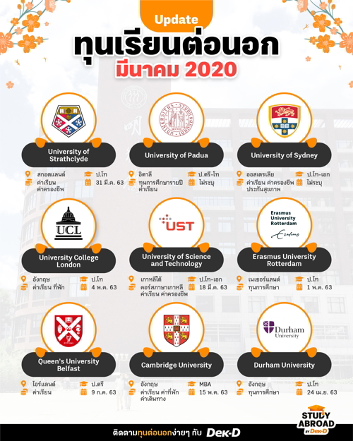 สวัสดีครับชาว Dek-D ถึงแม้ว่าช่วงนี้สถานการณ์ COVID-19 จะยังรุนแรงอย่างต่อเนื่อง ทำให้หลายมหาวิทยาลัยในต่างประเทศเลื่อนเปิดเทอม แต่อย่างไรก็ตามในส่วนของการสมัครทุนเรียนต่อก็ยังคงดำเนินการณ์อยู่เหมือนเดิมนะครับ และสำหรับเดือนนี้ก็มีทุนจากหลายที่น่าสนใจไม่น้อยเลย มีที่ไหนบ้าง วันนี้รวมมาให้แล้วครับ