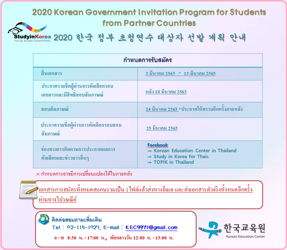 ประชาสัมพันธ์โครงการ 2020 Korean Government Invitation Program for Students from Partner Countries - 2020 한국 정부 초청연수 대상자 선발 계획 안 รัฐบาลสาธารณรัฐเกาหลี ได้มีการคัดเลือกนักเรียนระดับชั้นมัธยมศึกษาตอนปลายและนิสิตนักศึกษาระดับมหาวิทยาลัย เพื่อเข้าร่วมการอบรมระยะสั้นที่จะจัดขึ้น ณ สาธารณรัฐเกาหลีเป็นเวลา 10 คืน 11 วัน เป็นประจำทุกปี โดยได้สนับสนุนค่าตั๋วเครื่องบิน, ค่าใช้จ่ายในการอบรม โดยสามารถส่งเอกสารการสมัครได้ถึงวันที่ 13 มีนาคม 2563 (วันศุกร์)