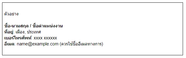 1. Personal Info (ชื่อและวิธีติดต่อ ที่อยู่ เบอร์โทร และอีเมล) ส่วนนี้เป็นข้อมูลที่สำคัญที่สุด วางอยู่ส่วนแรกด้านบนสุดของ CV