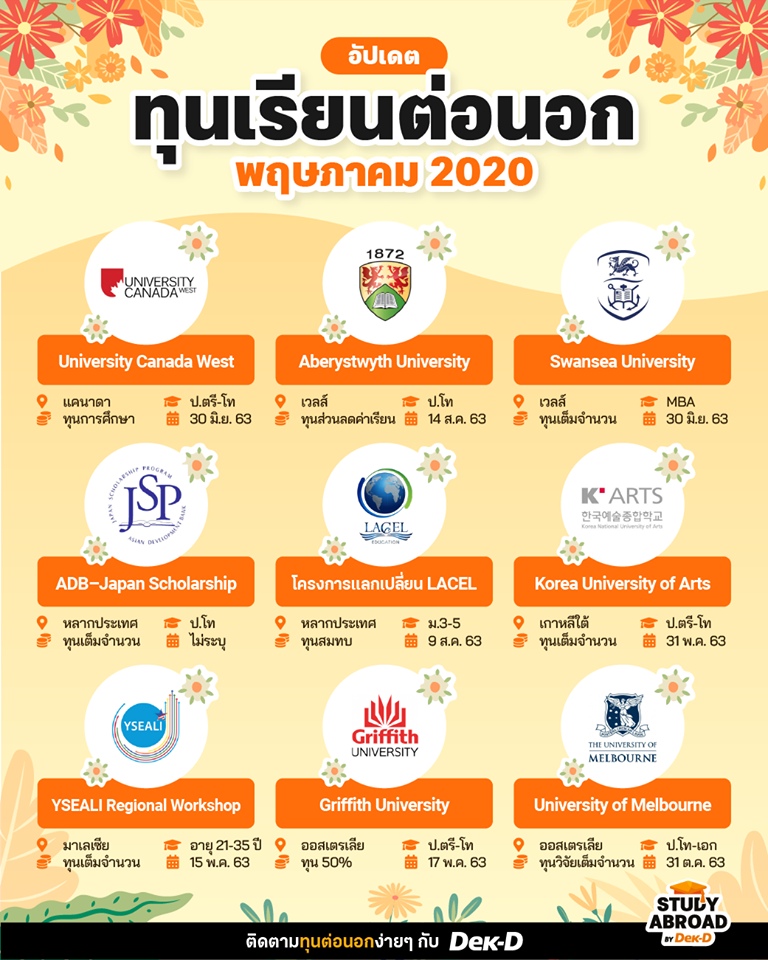 สวัสดีครับชาว Dek-D ตอนนี้ก็เริ่มต้นเดือนใหม่กันแแล้ว และเช่นเคยครับ วันนี้พี่วุฒิมีข่าวทุนเรียนต่อนอกที่กำลังเปิดรับสมัครอยู่ในช่วงนี้มาฝากกัน มีทุนอะไรน่าสนใจบ้าง ตามมาดูด้านล่างเลยค้าบบบ
