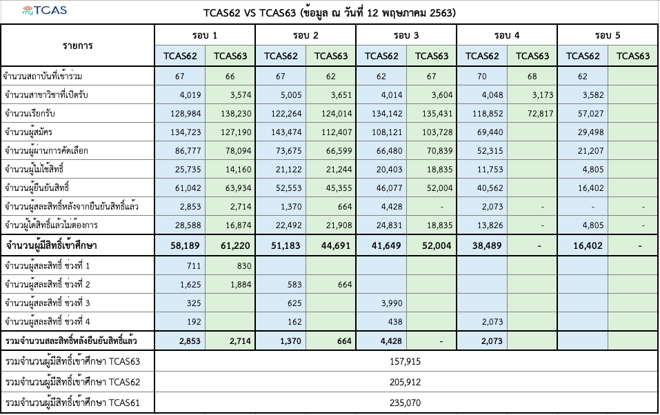 ทั้งนี้จำนวนข้างต้นยังไม่รวมถึงกลุ่มที่กำลังรอมหาวิทยาลัยดำเนินการเยียวยา ซึ่งกลุ่มนี้ คือกลุ่มที่เกิดความผิดพลาดในการประมวลการคัดเลือก เช่น หลักสูตรพยาบาลศาสตรบัณฑิต คณะแพทยศาสตร์โรงพยาบาลรามาธิบดี มหาวิทยาลัยมหิดล หรือ คณะวารสารศาสตร์และสื่อสารมวลชน มหาวิทยาลัยธรรมศาสตร์ โดยให้น้องๆ ติดตามสถิติใหม่อีกครั้งหนึ่ง หลังจากวันที่ 18 พฤษภาคม 63