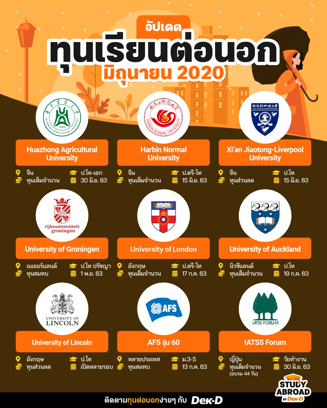 สวัสดีครับน้องๆ ชาว Dek-D ก่อนอื่นขออัปเดตนิดนึง ตอนนี้คอลัมน์เรียนต่อนอกและ One More Course เรามีทวิตเตอร์แล้วนะครับ ฝากไปกดติดตามกันหน่อยน้า เดี๋ยวจะมีอัปเดตข่าวทุน เรื่องเรียนต่อนอก และคอร์สเรียนน่าสนใจมาฝากตลอดเลยครับ ที่ twitter.com @tornokandcourse นะครับ ส่วนเดือนมิถุนายนนี้ มีทุนเรียนต่อนอกหลายทุนน่าสนใจทั้งนั้นเลย วันนี้พี่วุฒิได้รวบรวมมาให้แล้วครับ