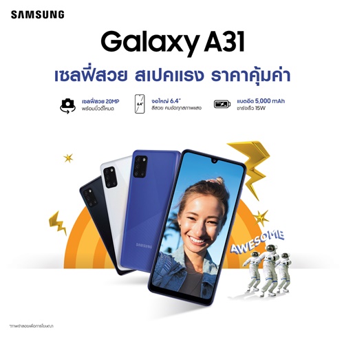 กาแลคซี่ A31 สมาร์ทโฟน เซลฟี่สวย สเปคแรง ราคาคุ้มค่า รุ่นล่าสุดจากตระกูล กาแลคซี่ เอ ซีรีส์ ที่มาพร้อมกล้องหน้าความละเอียดสูงถึง 20 ล้านพิกเซล เซลฟี่หน้ากระจ่างใสด้วยบิวตี้โหมดให้ทุกภาพเซลฟี่สวยสะดุดตาแบบไร้ที่ติ พร้อมปลดปล่อยความครีเอทีฟไปกับ ฟีเจอร์ AR Sticker และ AR Doodle สร้างสรรค์จินตนาการให้ภาพเซลฟี่โดดเด่นไม่เหมือนใคร นอกจากนี้ตัวเครื่องยังถูกออกแบบมาให้มีขนาดพอดีกับฝ่ามือ พร้อมหยิบขึ้นมาเซลฟี่ได้ไม่มีสะดุด ถ่ายแล้วปิ๊ง โพสต์แล้วป๊อป พร้อมเรียกยอดไลค์ได้ทุกเมื่อ